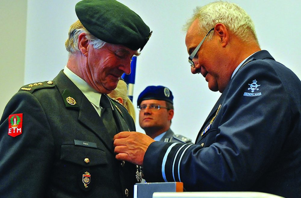 MAASTRICHT – Luitenant-generaal Bart Hoitink, Inspecteur generaal van het Nederlandse leger, heeft op vrijdag 8 augustus het Ereteken van Verdienste van het ministerie van defensie uitgereikt aan voormalig hartchirurg Prof. Dr. Olaf Penn. De onderscheiding, toegekend door minister Hennis-Plasschaert van defensie, bestaat uit een medaille in de vorm van een citadel. Penn, medisch adviseur van Hartpatiënten Nederland, kreeg de onderscheiding vanwege zijn verdiensten voor de reservisten van het Nederlandse leger.